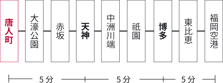 - 地下鉄空港線に乗車、天神駅から3駅目の唐人町駅で下車。